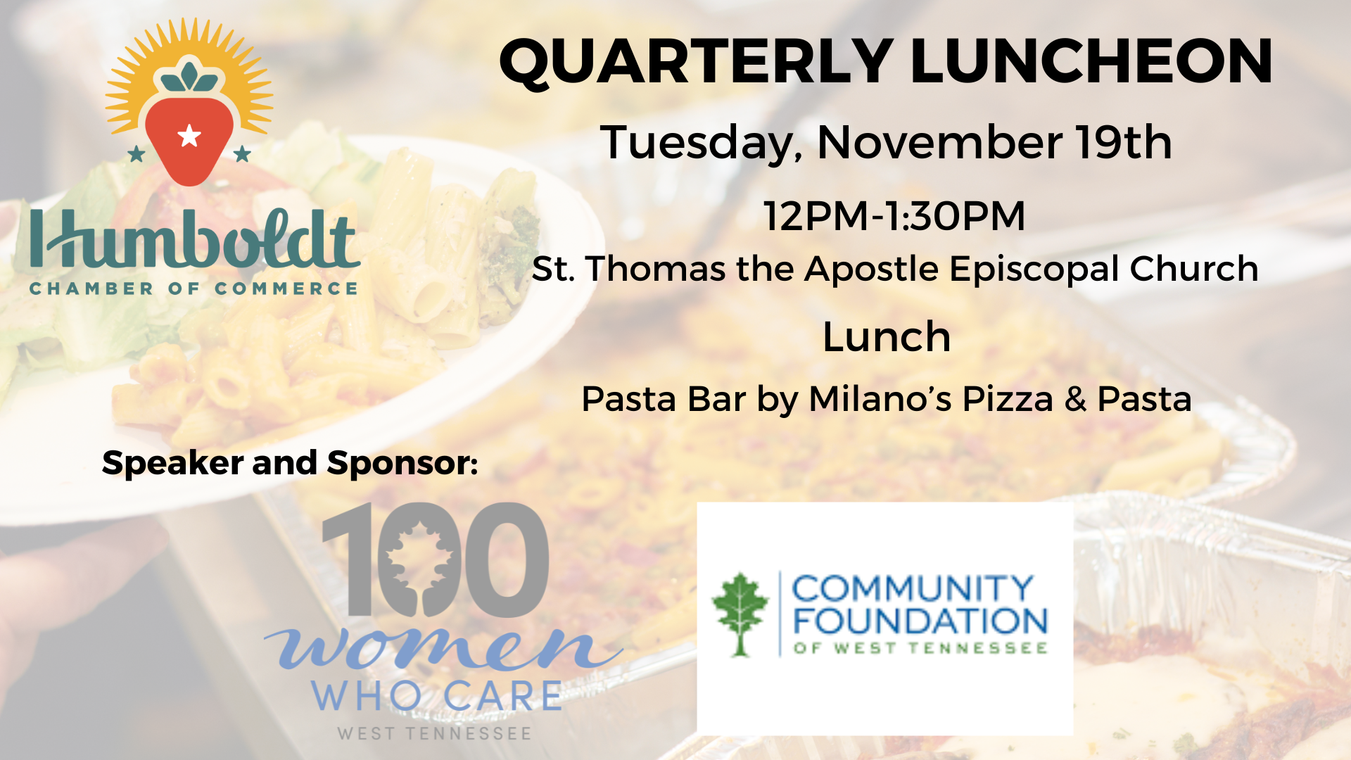 Join us for our 4th Quarter Chamber Luncheon on Tuesday, November 19th at St. Thomas the Apostle Episcopal Church. Our Speaker and Sponsor will be Community Foundation of West Tennessee who will be discussing 100 Women Who Care. Time at the end will be Q&A if desired. Ask about the speaker's topic, upcoming Chamber events, or hit us up for help at your business. Chamber Investors/Members, feel free to bring employees at your member rate or a potential (non)member for $15.