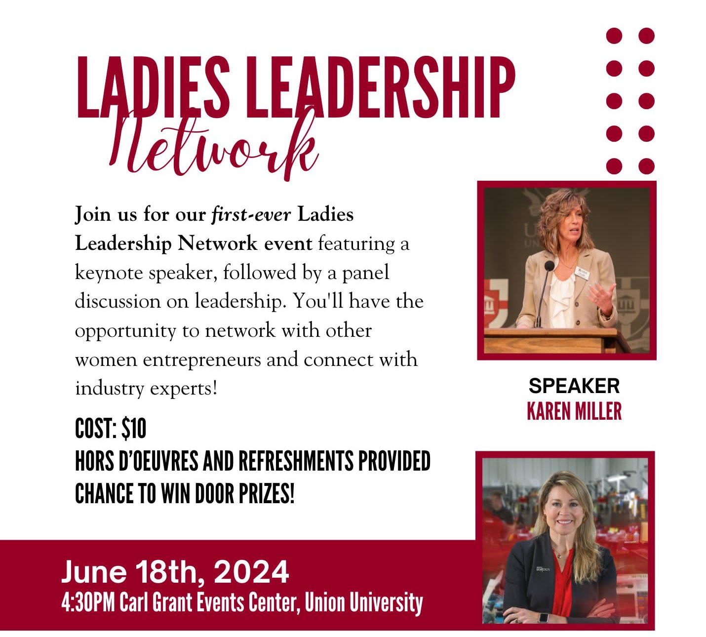 Join us on June 18th for our first-ever Ladies Leadership Network event at Union University. Hosted by the Union University McAfee School of Business in collaboration with the Crockett County, Humboldt, Greater Gibson and Milan Chambers of Commerce, it will include keynote speaker Karen Miller followed by a panel discussion on leadership. $10 to attend. Hors d'Oeurves and refreshments provided. Chance to win door prizes. Limited seating so grab your ticket today!
