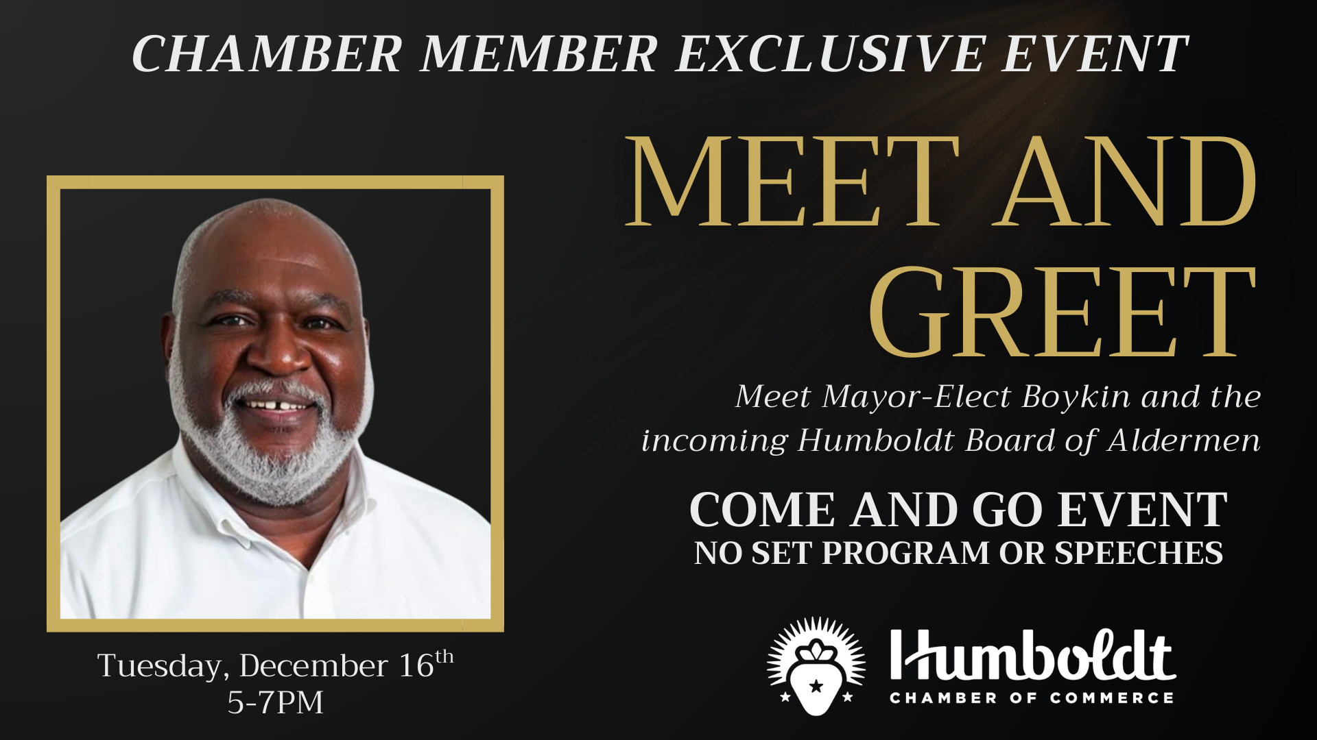 CHAMBER MEMBERS: Take this "come and go" opportunity to meet Mayor-Elect Arthur Boykin and the incoming Humboldt Board of Aldermen in a casual setting at the Humboldt Chamber this Tuesday, December 16th from 5-7PM. Light refreshments and good conversation. No set program or speeches. RSVP/Registration required.