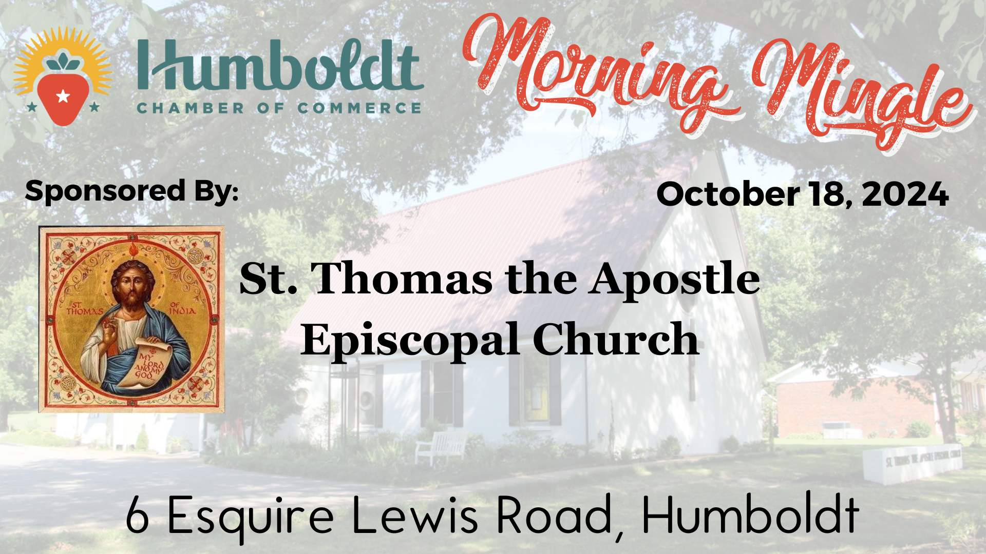 HUMBOLDT CHAMBER MEMBERS: Join us at 8AM for Morning Mingle at St. Thomas the Apostle Episcopal Church in Humboldt. Come network, get a tour of the church and get an update on what's happening in Humboldt and Gibson County. You're also welcome to bring a potential Chamber member with you for one event. Please bring your business cards to exchange with other attendees. (And don't forget to register for the door prize!)